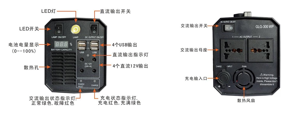 ◆ 用途广泛,满足室内医疗设备、小型打印机、各种灯具,小型鱼缸加热器、笔记本和户外露营、摄影、消防应急、抢险救灾等场合需要提供照明和交流电源时使用